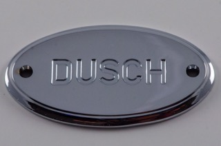 Oval dörrskylt i blank krom med svensk text: "Dusch"