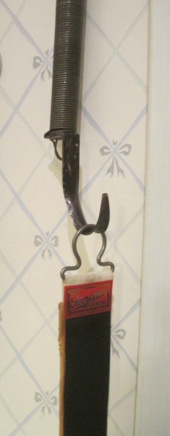 Rakstrigel av juteaktig textil och läder samt stålkrok för upphängning. Tillverkad i England.
