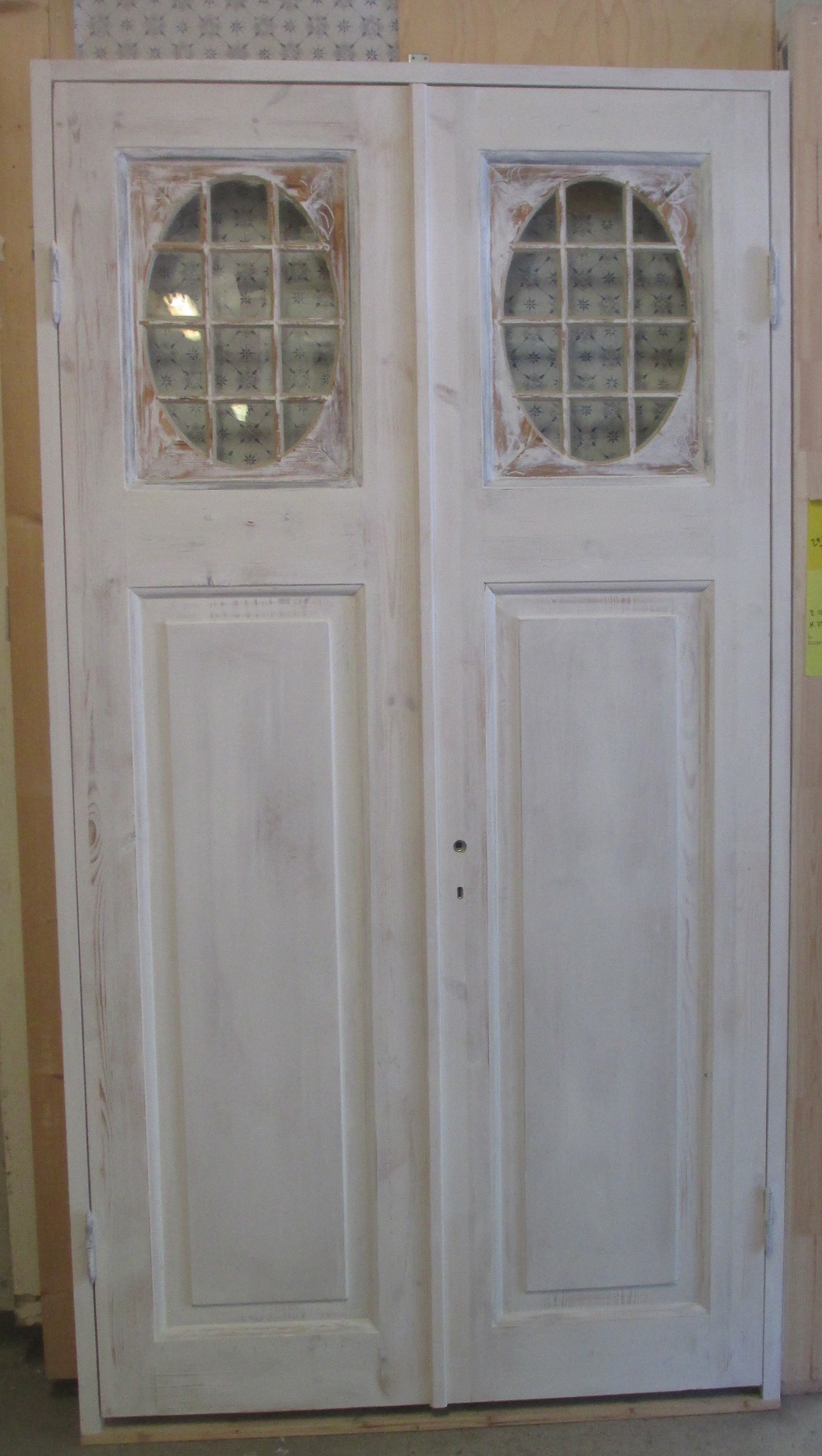 Fin pardörr med ovalt småspröjsat ljusinsläpp, komplett med karm