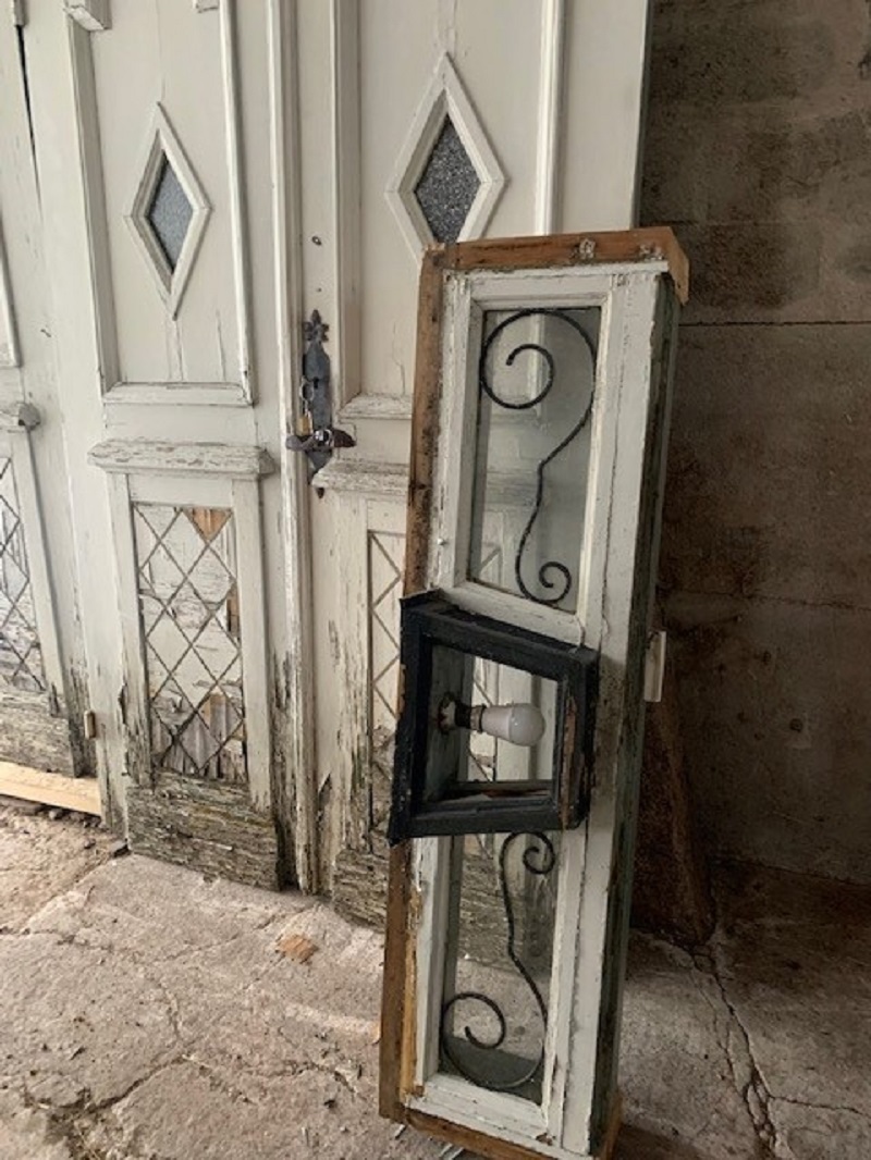 Dessa minst sagt ovanliga dörrar med överljus kommer från en gård utanför Jönköping. Dessa är i behov av lite lagning, vi kan hjälpa med detta. Överljuset har plats för belysning och har även en karm. Dörren har ingen karm.