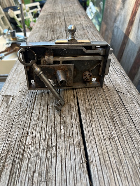 Fint gammalt kammarlås med nattregel, denna är för en vänsterhängd dörr, ring in till oss om du vill ha för en högerhängd dörr, 08 -55 66 09 99