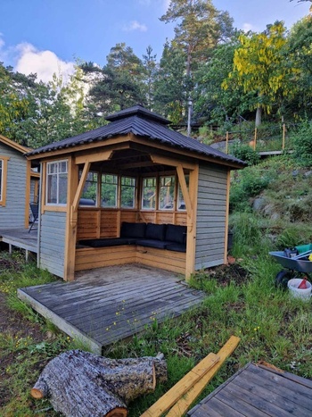 Mått, ytterkant till ytterkant 3200*3200 sedan är det givetvis lutning på taket, höjd när jag mäter bara vägg är ca: 2500 sedan tillkommer taket.