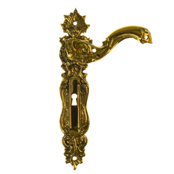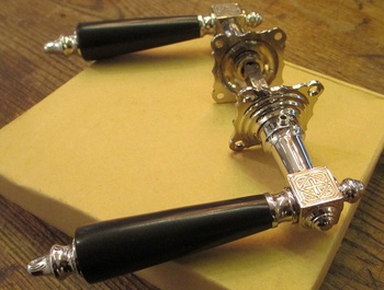 Utsirat dörrtrycke i blank förnicklad mässing.