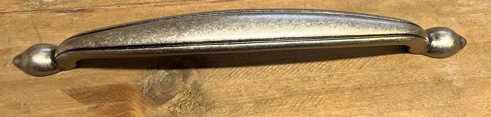 Lådhandtag/bygel i tenn. Handtaget fäst från insidan med 2 medföljande skruv.