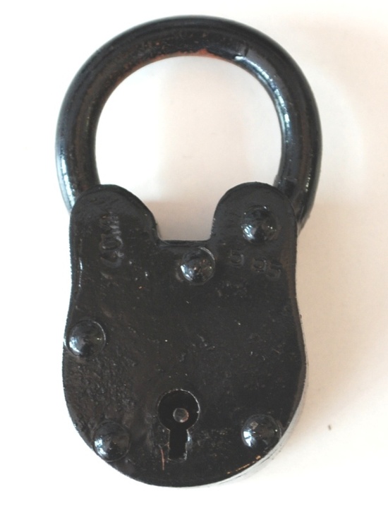Hänglås i svart smide med stor bygel. Två nycklar följer med.