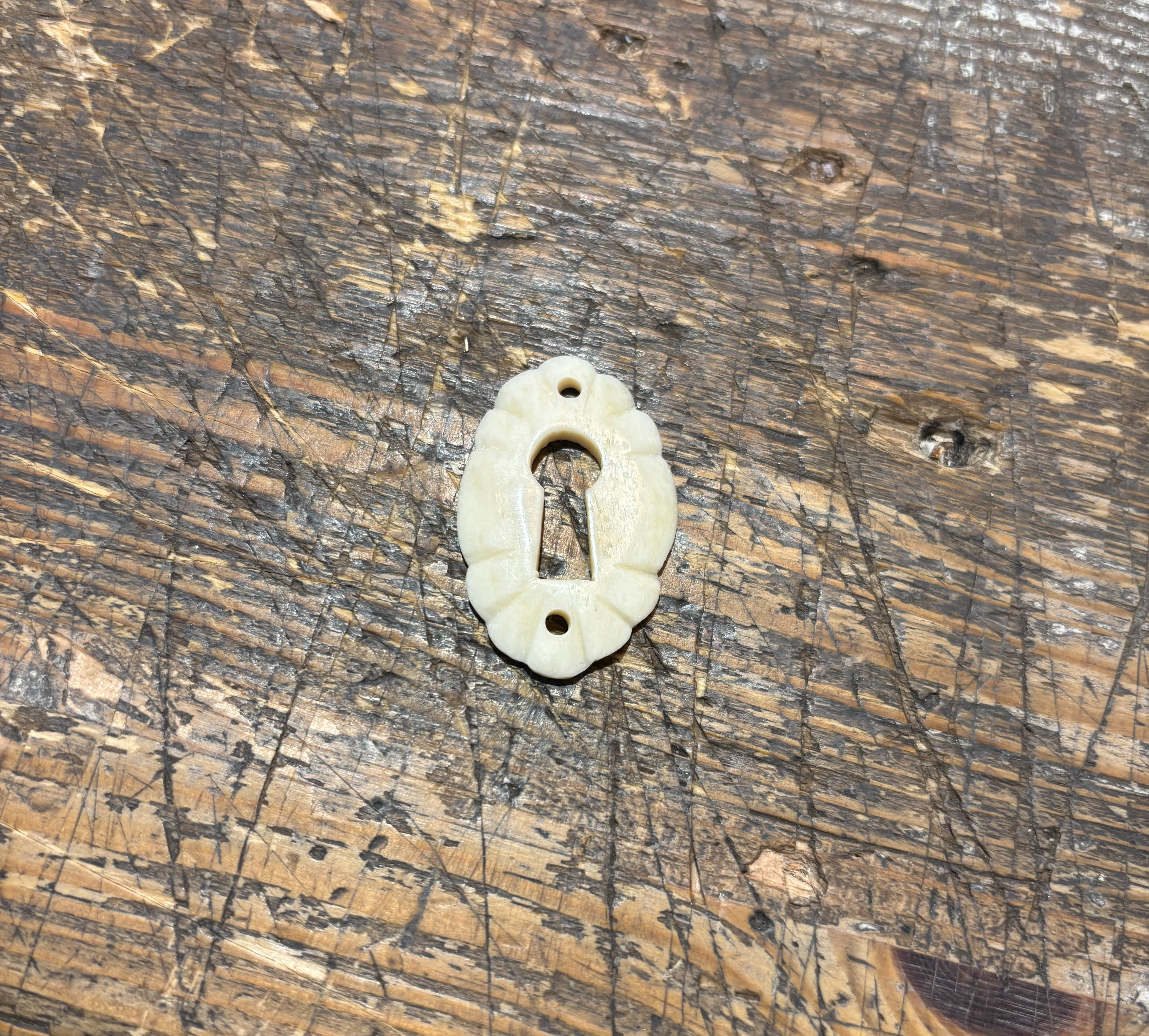 Nyckelskylt i ben till möbler.