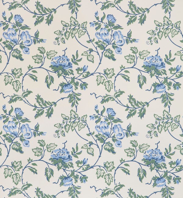 Denna tapet från Sundfiske i Dalarna har ett mönster med mjukt slingrande blomrankor av en typ som tyder på ett samband med samtida tygtryck - möjligen kan tapeten t o m var tryckt med stockar som var avsedda för tygtryck. Mönstertypen hör hemma i Karl-Johan-tiden men förekom till 1800-talets senare hälft.