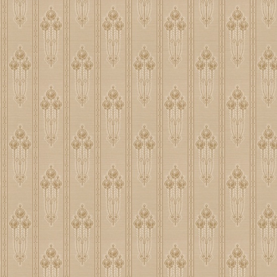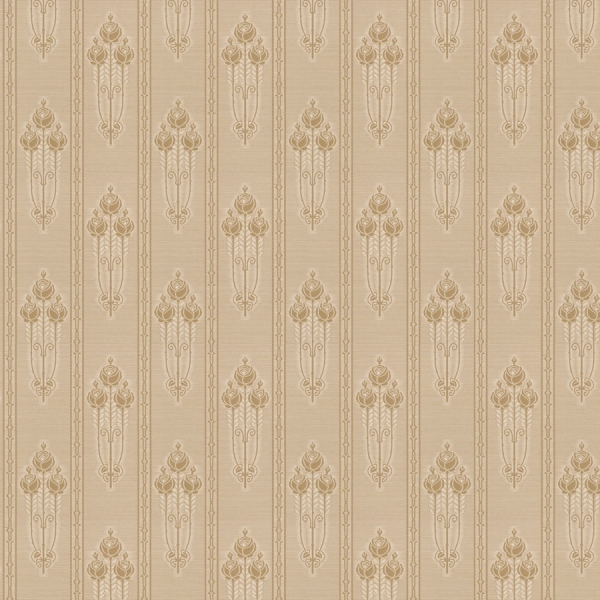 Jugendperioden (ca 1890-1920) var förhållandevis kort i Skandinavien, men det finns en hel del interiörer bevarade. Det här vackra, stiliserade och textilimiterande rosenmönstret, är tryckt med originalvalsar. Dåtidens materialimitatörer var väldigt kunniga och valsstickarnas hantverksskicklighet var väl utvecklad. Det är fascinerande att se hur de, som i Jugendros, har lyckats skapa en textil verkan med endast två mönstervalsar mot en bottenkulör. Jugendperioden karaktäriseras av olika stilideal och det här mönstrets formspråk tillhör de mer strikta och idén om en mönsterfördelning på tretal (något som t ex George R Macintosch använde flitigt). Här i form av rosor som delar upp sig med två lägre på ömse sidor om en högre.