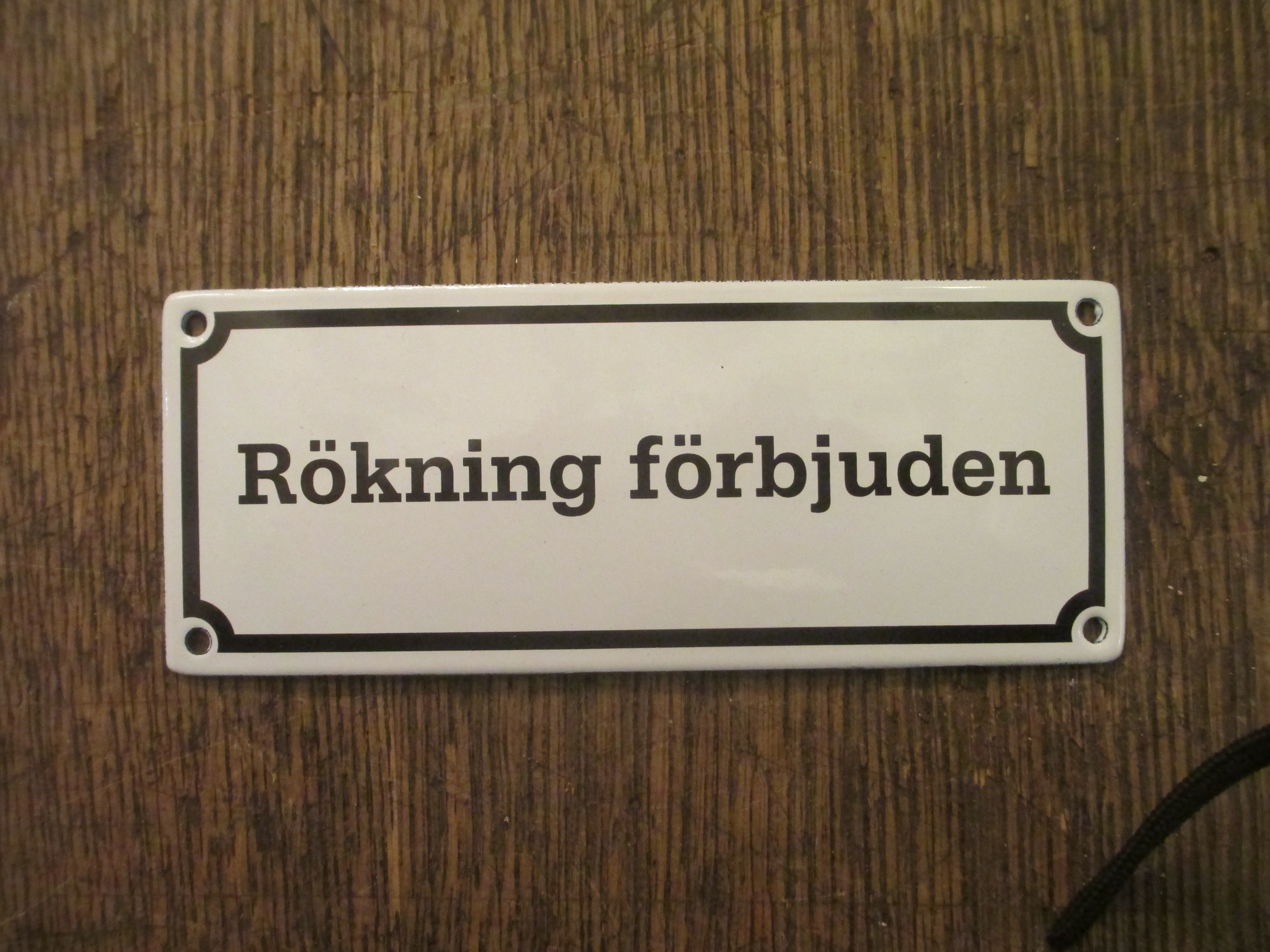 Emaljskylt, vit med svart text "Rökning förbjuden"