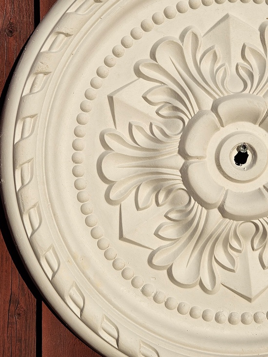 Artikelnr tr2501Vackert dekorerad takrosett med en blomma i centrum och bladverk som omringar den.